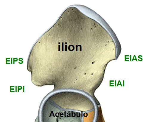 El ilion, es el hueso más grande y superior de los tres que componen el hueso coxal o pelvis, y tiene cuatro extremos: uno anterior superior, denominado espina ilíaca anterosuperior (EIAS); otro anterior inferior, denominado espina ilíaca anteroinferior (EIAI); otro posterior superior, denominado espina ilíaca posterosuperior (EIPS) y un último extremo posterior e inferior, denominado espina ilíaca posteroinferior (EIPI).