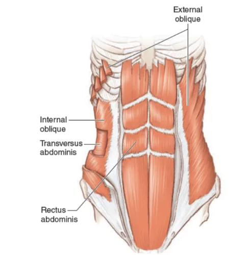 - Transverso del abdomen – se origina en el labio interno de la cresta ilíaca. Contribuye a la estabilización del tronco y la pelvis, la compresión abdominal (funciones como toser, estornudar o levantamiento de objetos pesados), soporte de órganos internos, mantenimiento de la postura y participa en la respiración durante la exhalación forzada.