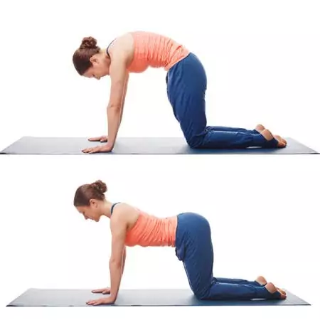 El gato; este ejercicio es muy conocido en el mundo del pilates, ya que suele ser muy usado, tanto por su sencillez como por sus beneficios. Nos colocamos en posición de cuadrupedia, manos debajo de los hombros y rodillas debajo de la cadera, la espalda recta (si tuviéramos un palo debería de tocar sacro, zona dorsal y cabeza), y nos encorvamos todo lo que podamos, y después vamos a la posición contraria.
